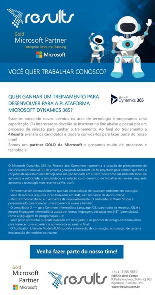 Neste mês, a 4Results está disponibilizando, para a cidade de Curitiba, um treinamento avançado em desenvolvimento para o Dynamics 365. O objetivo é formar novos talentos em tecnologias Microsoft Cloud para o mercado.