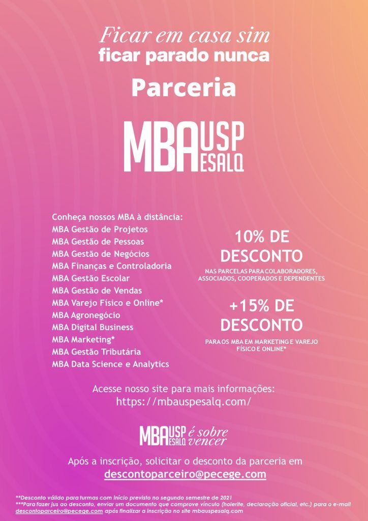 Após a inscrição, solicitar o desconto (anexar comprovante de vínculo com instituição conveniada: holerite, crachá, etc.) no e-mail: descontoparceiro@pecege.com.